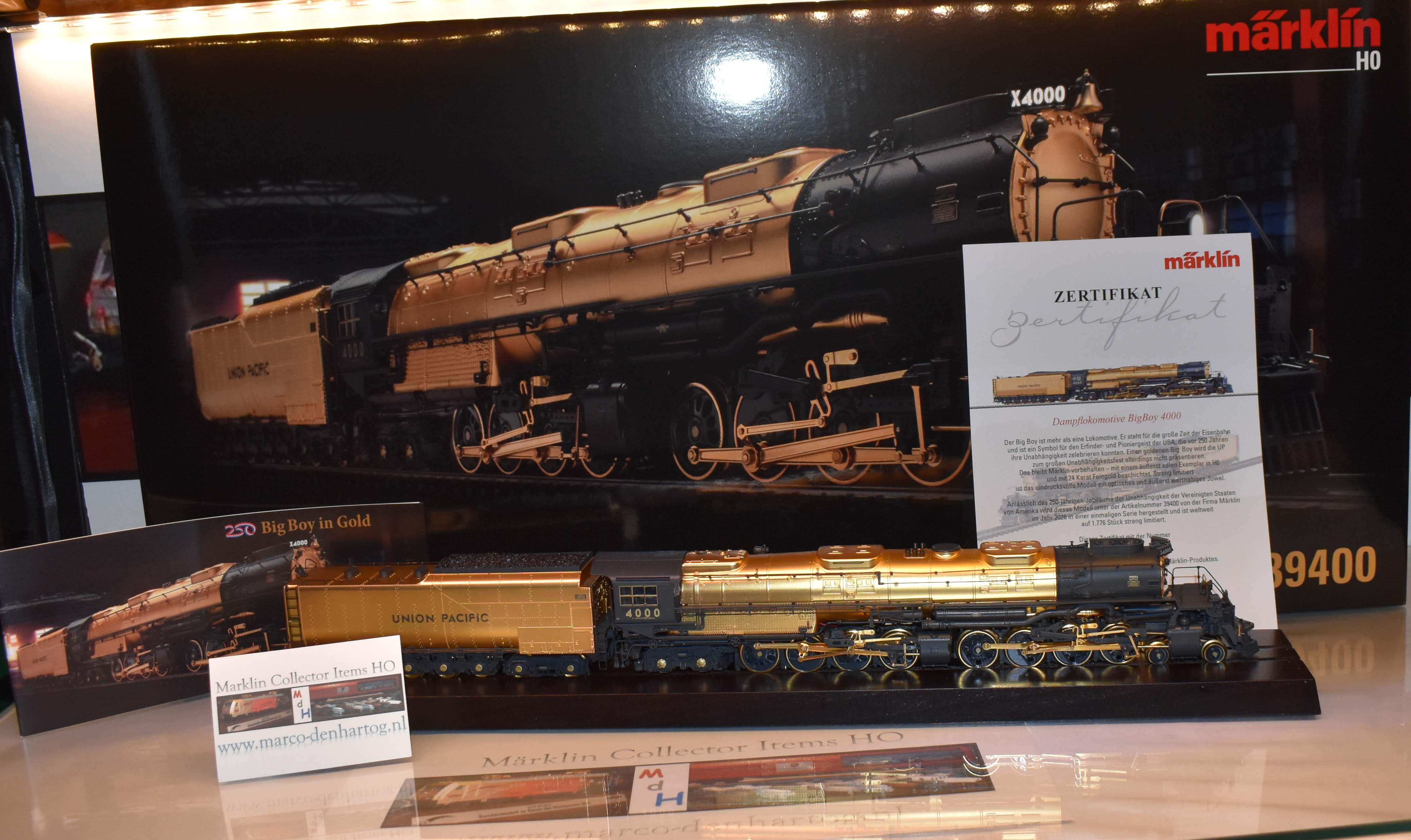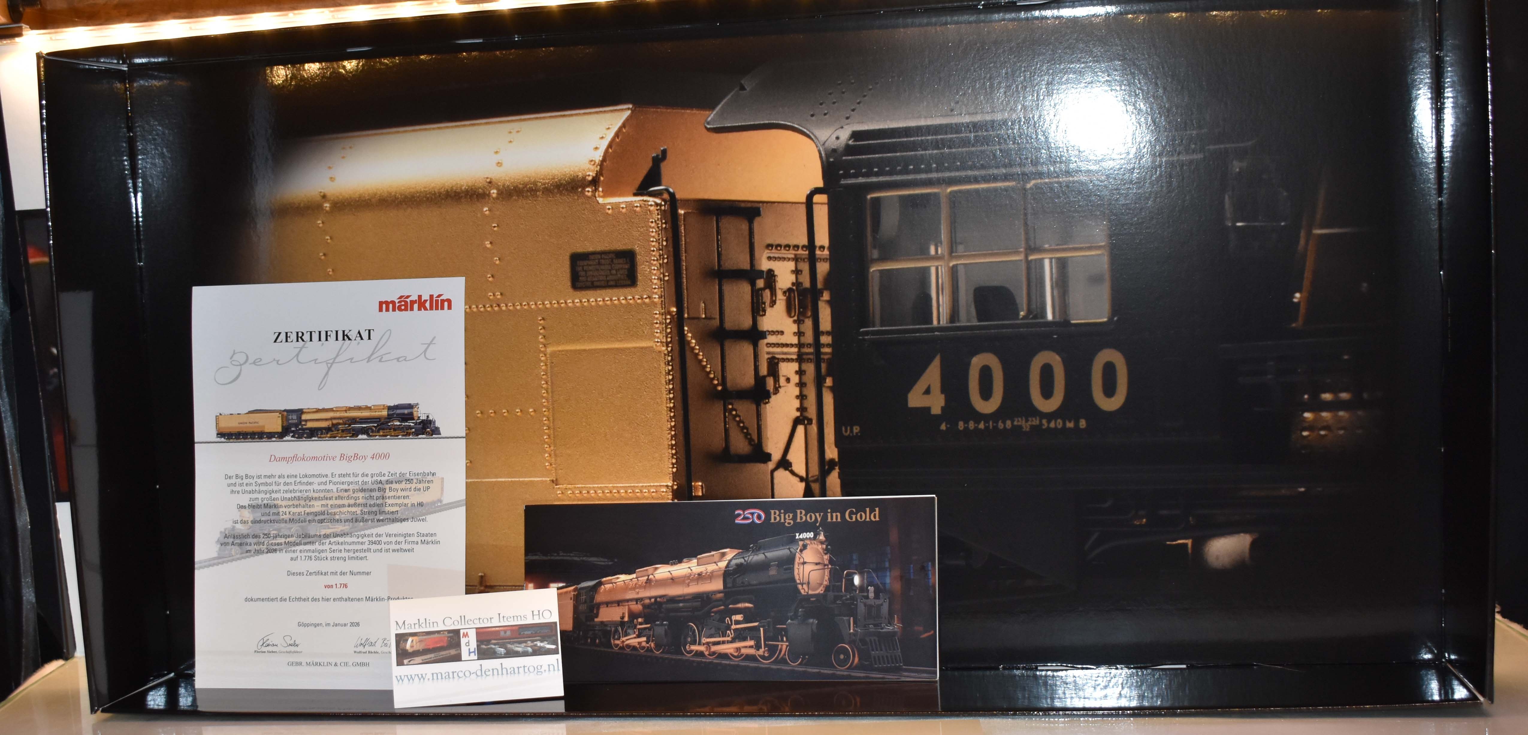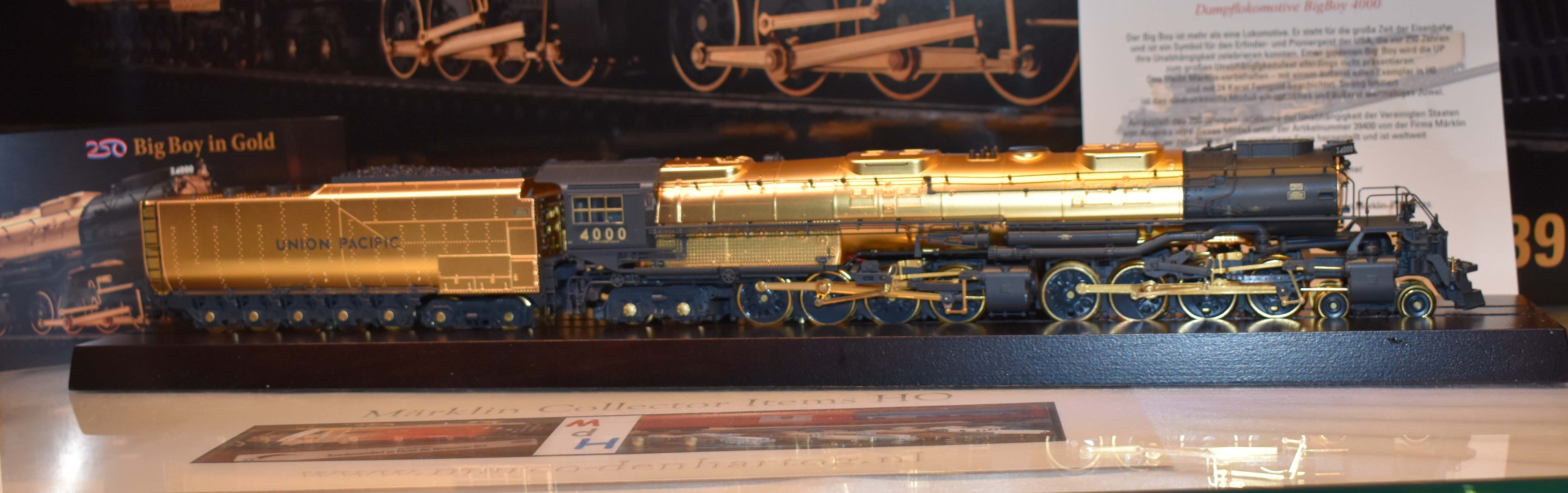 Big Boy - De Gouden Eeuw van de spoorwegen Veel woorden spenderen aan de legendarische Big Boy van de Union Pacific Railroad (UP) is water naar de zee dragen. Deze reusachtige wereldwijd beroemde machine is veel meer dan gewoon een locomotief. Ze kenmerkt de bloeiperiode van de spoorwegen en is een symbool voor de uitvinders van- en de pioniersgeest in de Verenigde Staten van Amerika die 250 jaar geleden hun onafhankelijkheid vierden. In dit land van de onbegrensde mogelijkheden is niets onmogelijk. De Big Boy is een perfect voorbeeld van het onbegrensde zelfvertrouwen van de Amerikanen uit de USA. Een gouden Big Boy zal de UP echter niet presenteren bij het grote feest van de onafhankelijkheid. Dat is voorbehouden aan Märklin met een ongekend schitterend model van de Big Boy 4000 in H0, verguld met 24-karaats goud. In aantal streng gelimiteerd is dit indrukwekkende model een zeer waardevol juweel dat schitterend is om te bekijken.