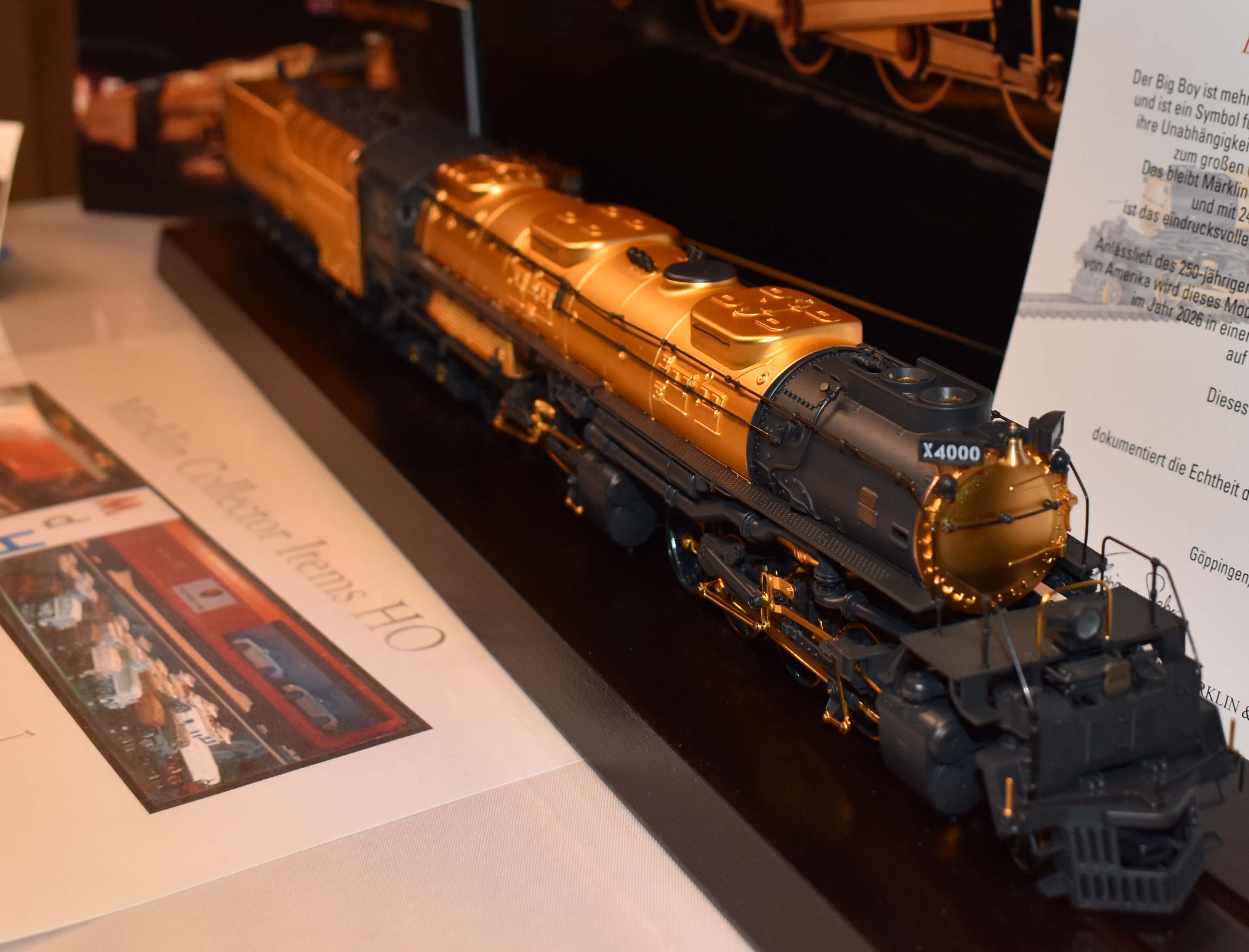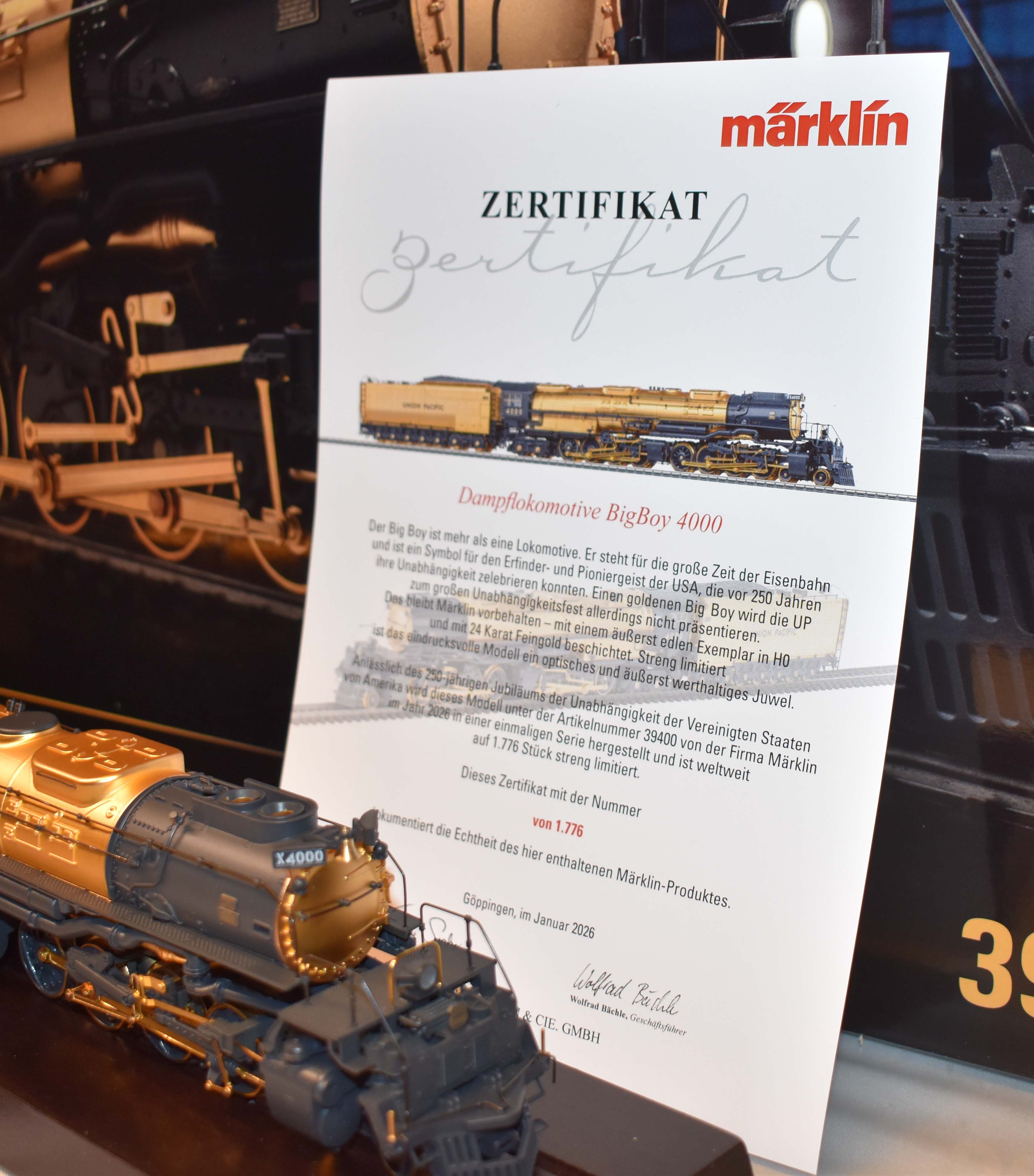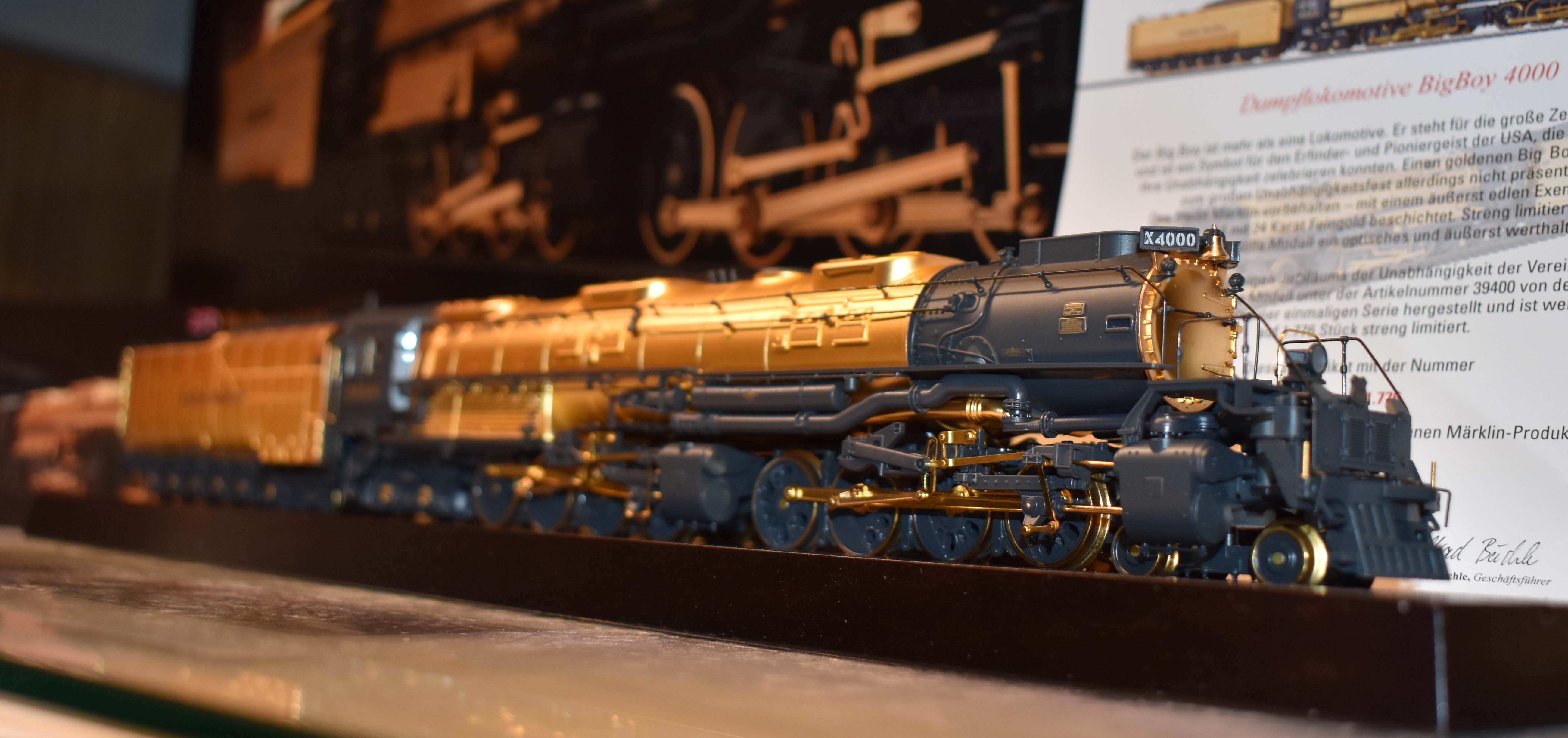 Big Boy - The Golden Age of Railroading Not much more can be said about the legendary Big Boy der Union Pacific Railroad (UP) that would not be like carrying coals to Newcastle. This gigantic unit is famous around the world and is more than just a locomotive. It stands for the great era of railroading and is a symbol for inventive and pioneering spirit of the United States of America, which can celebrate 250 years of independence. Nothing is impossible in the land of unlimited possibilities and the der Big Boy is truly an example for this steadfast confidence of Americans. The UP will certainly not present a golden Big Boy for this great independence celebration. This remains reserved for Märklin - with an extremely fine Big Boy 4000 in H0, plated in 24 carat gold. Strictly limited, this impressive model is a visual and extremely enduring gem. Highlights: Limited worldwide to 1,776 locomotives.