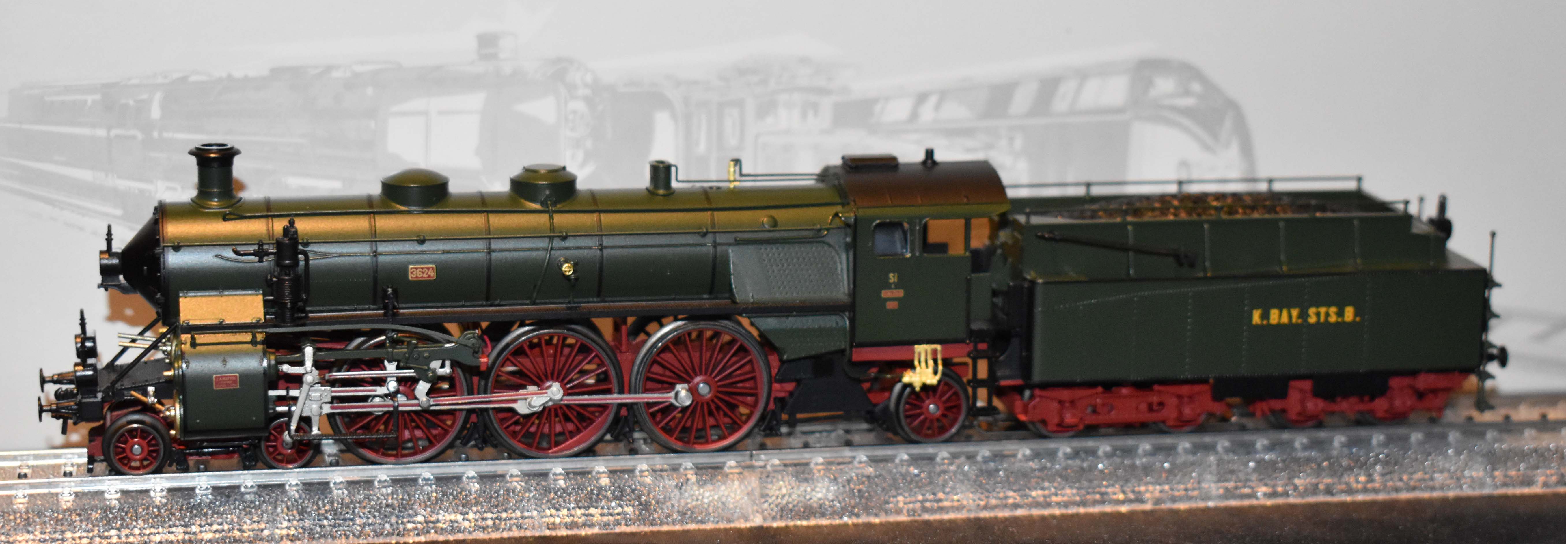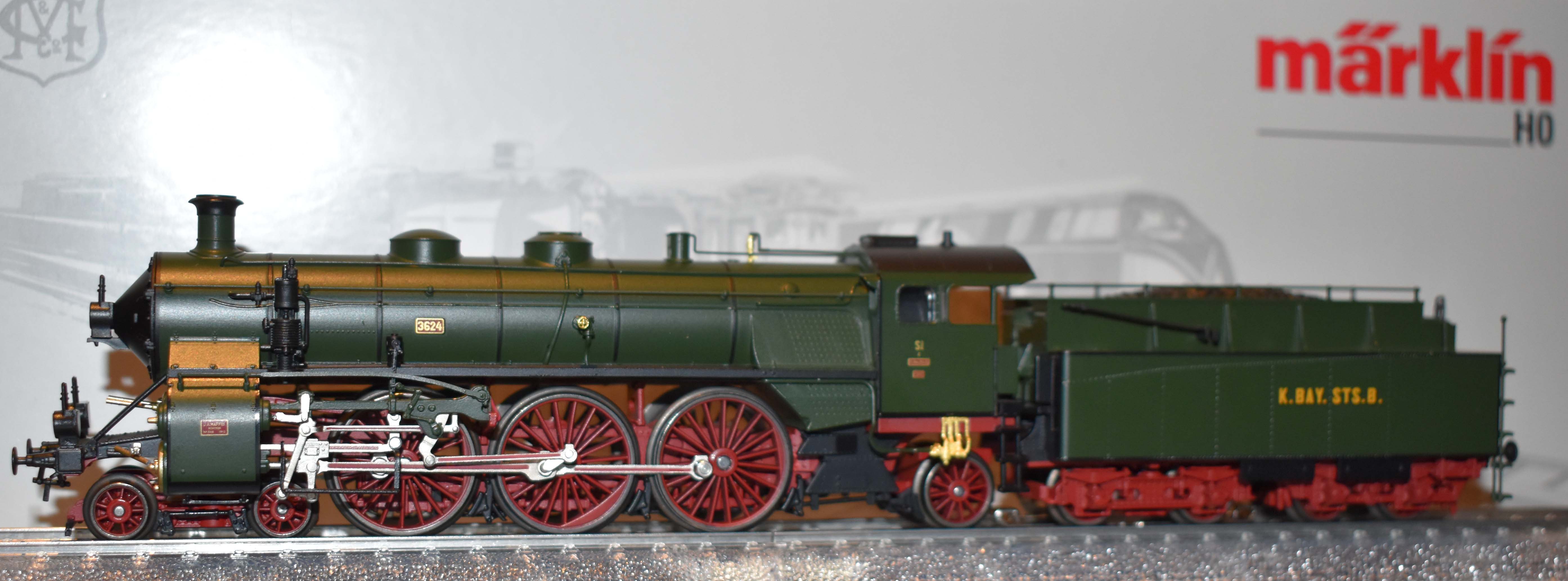 *Marklin 39436 Sneltrein-stoomlocomotief uit de Beierse serie S 3/6 als loc van de K. Bay. Staatseisenbahnen, subserie d, die "Langbenige" met een drijfwieldiameter van 2.000 mm. Bedrijfsnummer 3624. De latere 18 441. Zoals in gebruik rond 1912.